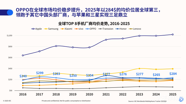 均价是衡量品牌高端化成色最直接的标尺。IDC 数据显示,2025 年 OPPO 全球智能手机均价达 284 美元,在全球出货量 TOP 8 厂商中仅次于苹果与三星,位列第三,同时以显著优势领跑所有其他中国头部手机品牌。